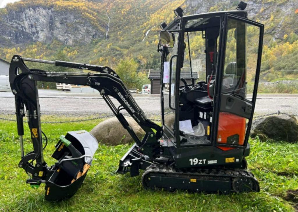 Selger lite brukt minigraver med heimelaga rotor og powertilt er steelwrist.