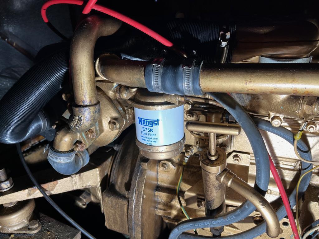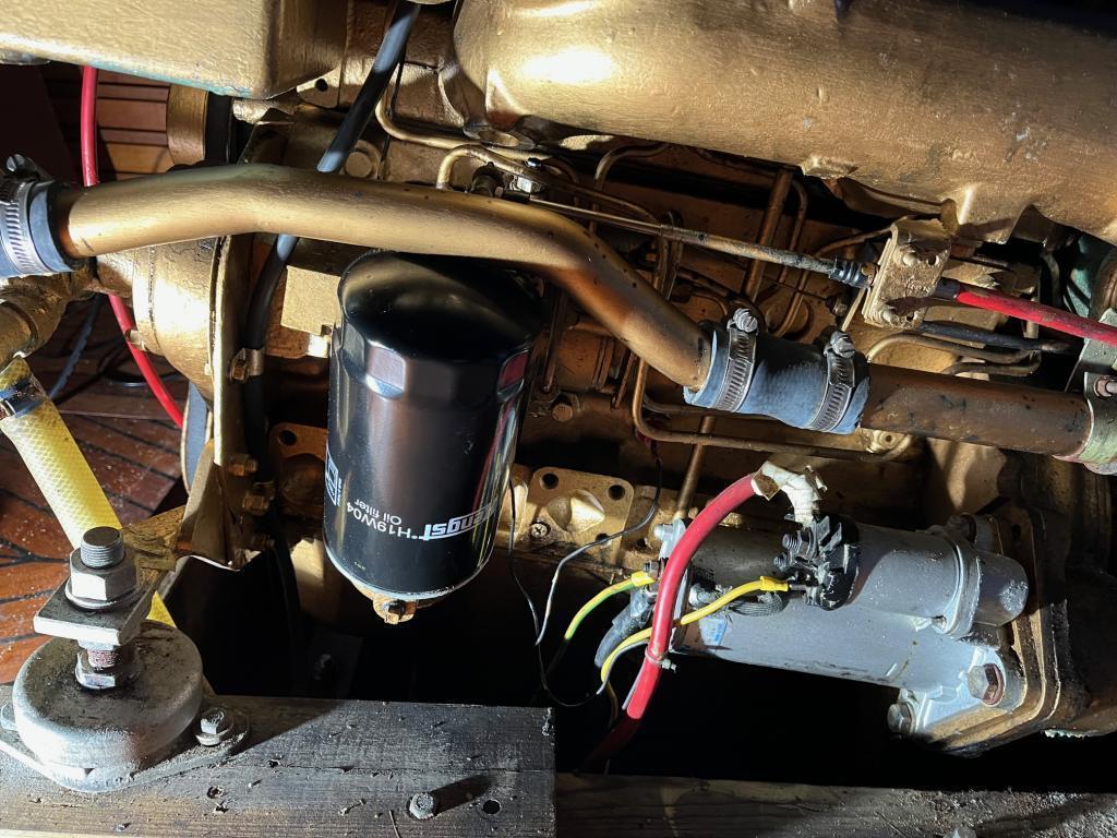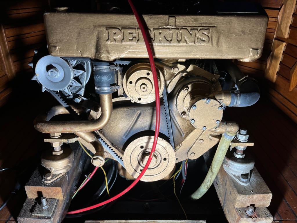 Perkins 49 Hk diesel montert ca. 1980, gangtid ukjent, den har aldri sviktet og er utrolig billig i drift.