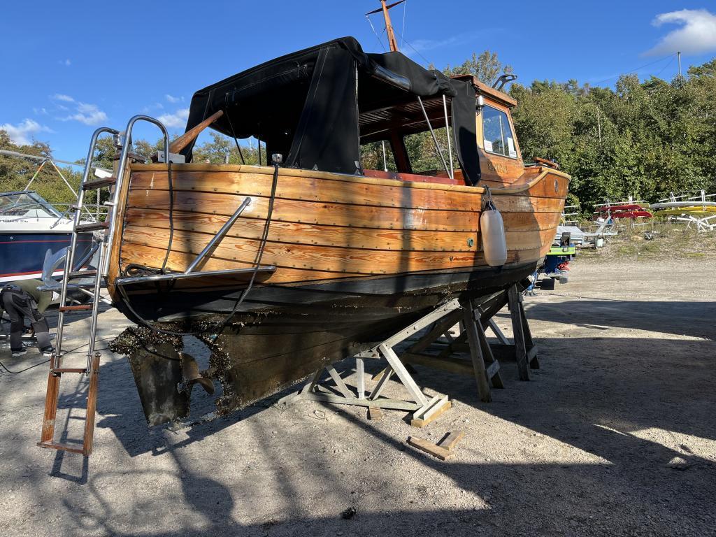 Båten står i vinteropplag i en båthavn utenfor Fredrikstad.