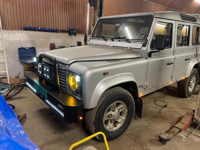 Laserskjært i framfanger for å få på plass lykter og lys. 2 Leddbarer 200 w + 2 X-lykter i front.