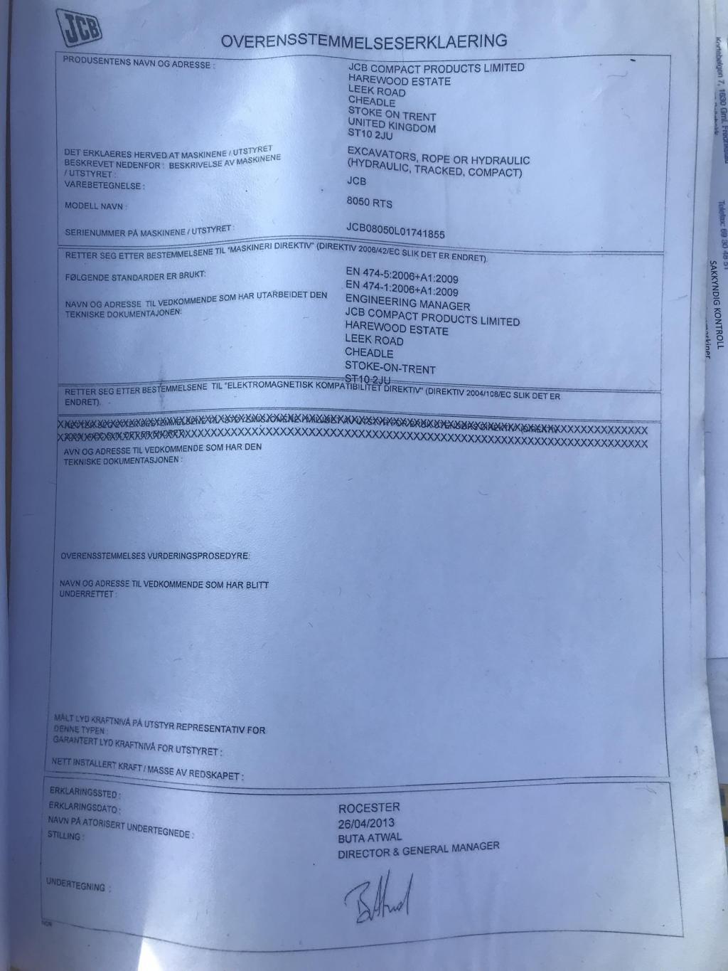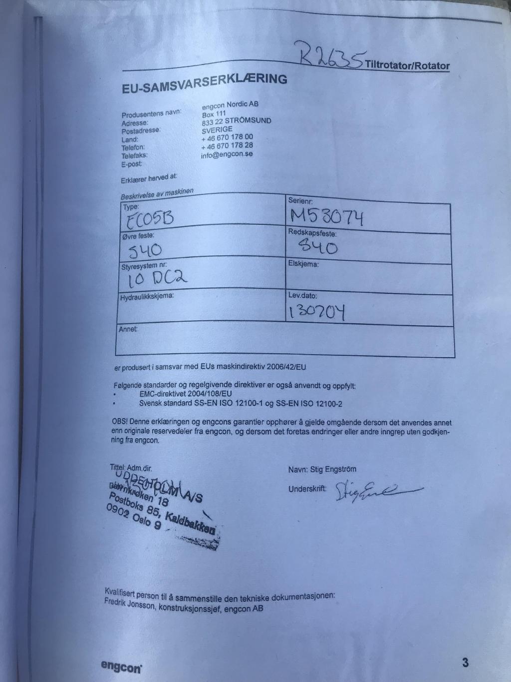 Alt av CE- og samsvarserklæringer, instruksjonsbøker og årskontroller til maskinen følger med.